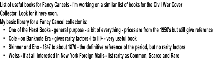 This is the newest book on Fancy Cancels. It is the tracing complied by Mr Whitfield. The book is edited by Roger Curran for the US Cancellation Club. If you are reading this you should join. |